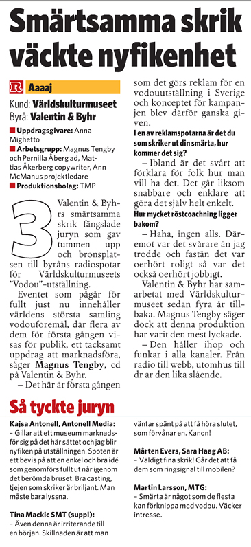 Idag är jag en glad skit. Sådär glad som man blir när det står klart att man kämpat sig till en pallplats i Månadens radio i Resumé. Vi – det är Valentin & Byhr tillsammans med produktionsbolaget TMP – kom trea med radiospottarna Aaaaj och Förlåt om jag stör för voodoo-utställningen på Världskulturmuseet. Att vi för två veckor sedan fick bronset också i Månadens banner förstärker såklart glad-skit-känslan.